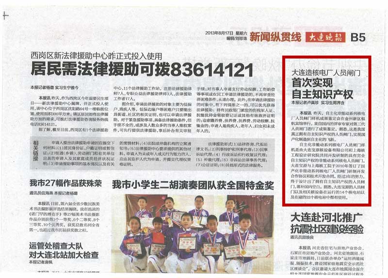 《大连晚报》在2013年8月17日 B5版,以“大连造核电厂职员闸门 首次实现自主知识产权”为问题对大连宝原核装备有限公司“自主化非能动系列核电厂职员闸门样机”效果判断会举行了报道。原文转载如下: